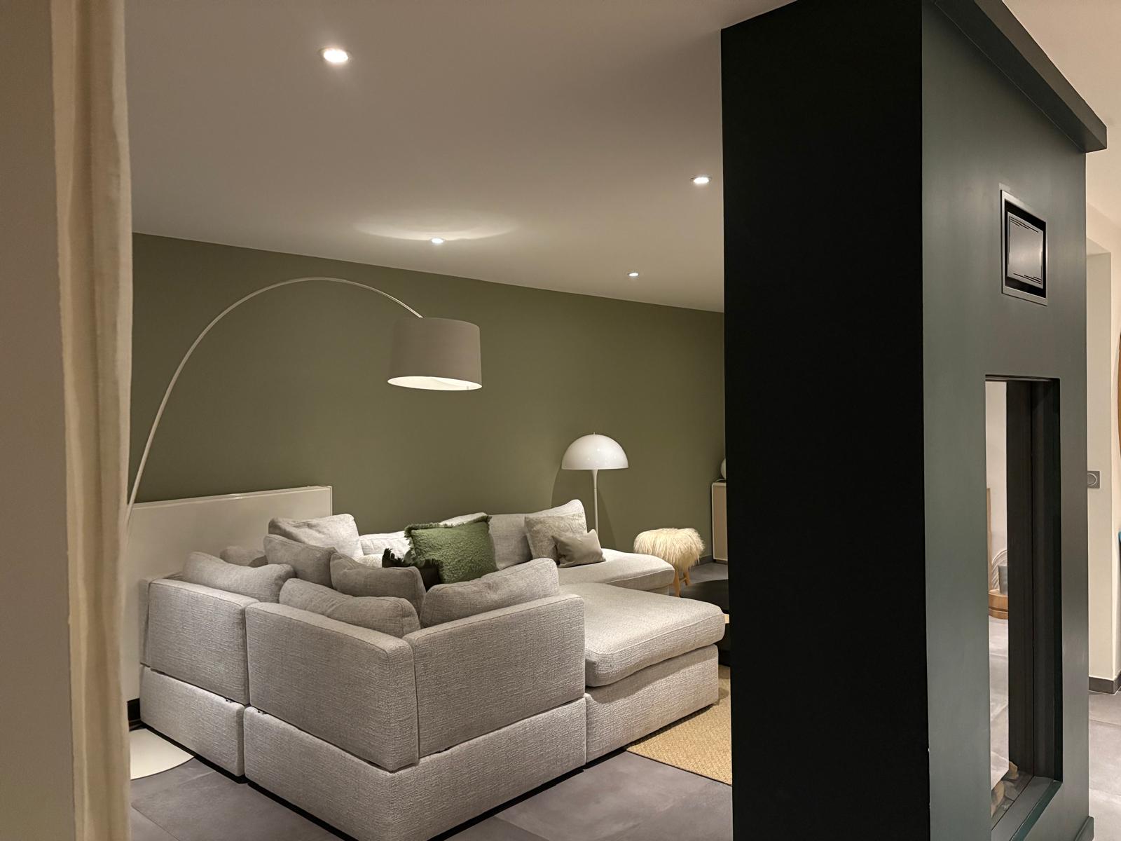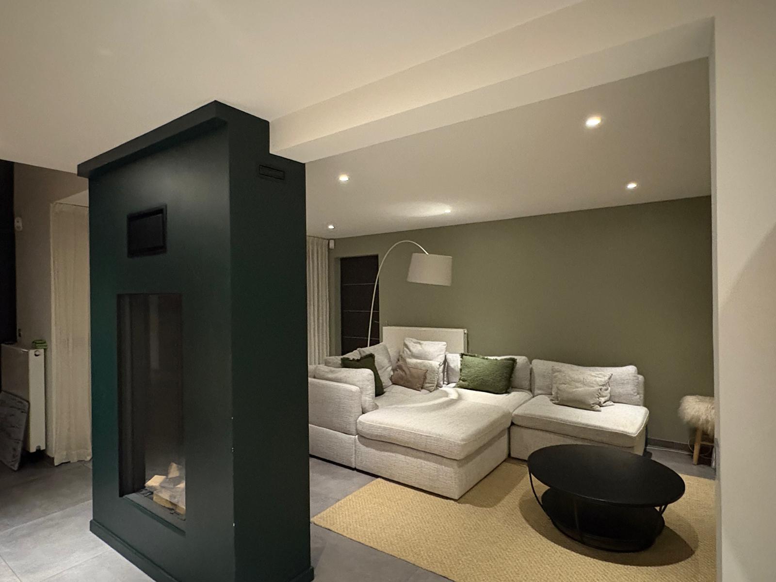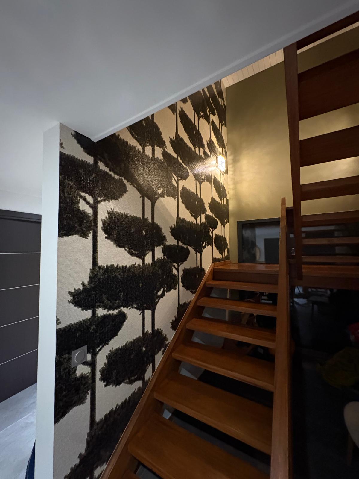 Dans cette maison familiale nichée au cœur des Alpes, chaque détail a été pensé pour révéler l’existant tout en apportant du caractère. Les murs blancs d’origine servent de base lumineuse, ponctués de touches de peinture aux teintes douces pour structurer les espaces avec subtilité. La cheminée, pièce centrale du salon, a été mise en valeur par un vert plus profond, créant un contraste élégant et affirmé. Un choix fort qui attire le regard tout en renforçant l’atmosphère chaleureuse de la maison. Dans la cuisine, un mur teinté vient rythmer l’espace et dialoguer avec les autres éléments, apportant cohérence et douceur. Enfin, l’escalier se distingue par un papier peint qui accompagne le mouvement et transforme ce lieu de passage en véritable expérience visuelle. Un projet pensé comme un équilibre entre simplicité, caractère et chaleur.