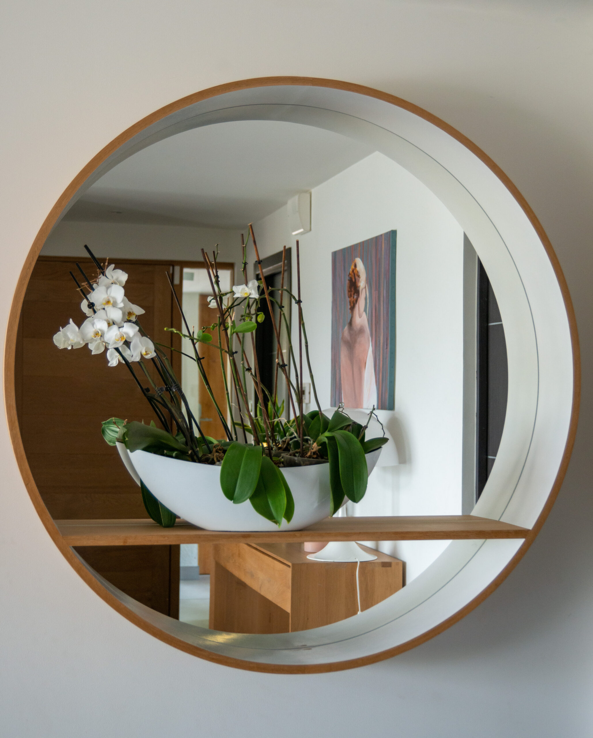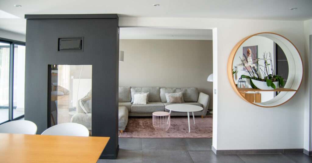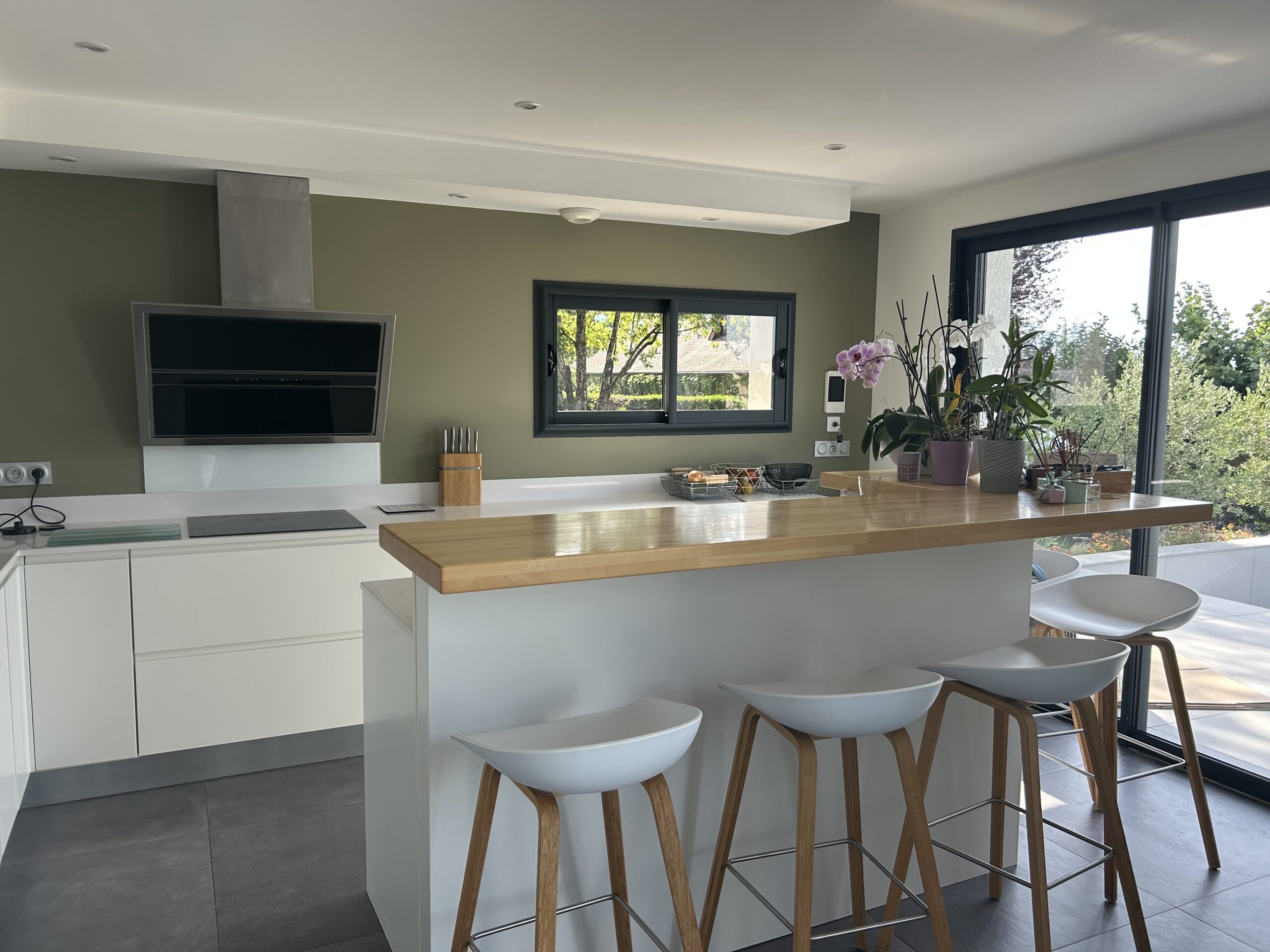 Dans cette maison familiale nichée au cœur des Alpes, chaque détail a été pensé pour révéler l’existant tout en apportant du caractère. Les murs blancs d’origine servent de base lumineuse, ponctués de touches de peinture aux teintes douces pour structurer les espaces avec subtilité. La cheminée, pièce centrale du salon, a été mise en valeur par un vert plus profond, créant un contraste élégant et affirmé. Un choix fort qui attire le regard tout en renforçant l’atmosphère chaleureuse de la maison. Dans la cuisine, un mur teinté vient rythmer l’espace et dialoguer avec les autres éléments, apportant cohérence et douceur. Enfin, l’escalier se distingue par un papier peint qui accompagne le mouvement et transforme ce lieu de passage en véritable expérience visuelle. Un projet pensé comme un équilibre entre simplicité, caractère et chaleur.